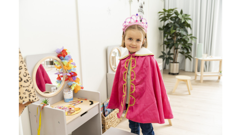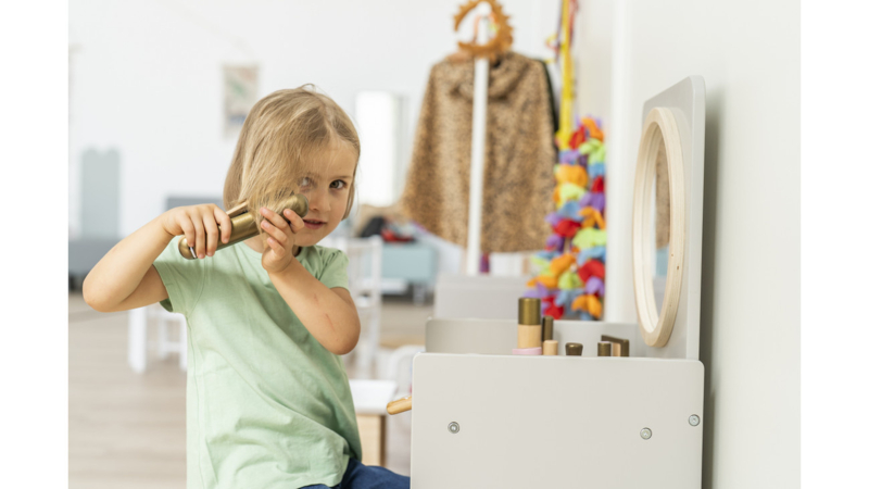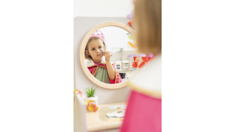 Deze neutraal ontworpen spiegeltafel maakt van de poppenhoek een populaire ontmoetingsplaats. Als u meerdere spiegeltafels in de groepsruimte of in de rollenspelruimte neerzet, ontstaat er zelfs een ‘echte’ salon waar kinderen graag samenkomen. Het is aan de fantasie van de kinderen om te bepalen waarvoor ze de tafel gebruiken: of het nu als make-uptafel, kaptafel of kapperszaak is – of als wastafel volgens Montessori – het stimuleert de creativiteit en zelfstandigheid van de kinderen. Jongens en meisjes kruipen in de huid van klanten en laten zich door een ander kind op speelse wijze scheren, knippen of schminken. Daarbij leren de kinderen wensen te formuleren en te vervullen. Ze trainen hun sociale vaardigheden, zoals communicatie en empathie. Hun woordenschat groeit en ze duiken in tot nu toe onbekende werelden. De kaptafel is een mooi rekwisiet voor kleine toneelstukjes die de kinderen opvoeren. Zo leren ze bewust in een andere rol te kruipen. Vooral als ouders en grootouders in het publiek zitten, is het speelplezier groot.