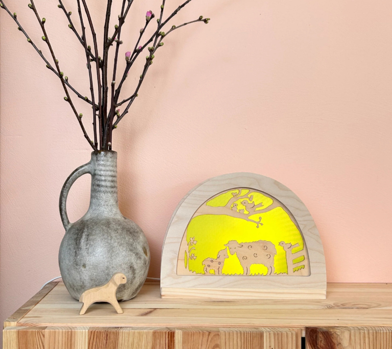 Elke laag onthult een nieuwe scène: dartelende lammetjes, zonovergoten avonturen, dwarrelende herfstbladeren en knusse winterpret. De uitgesneden figuren komen tot leven zodra het licht aangaat en zorgen voor een magische sfeer in elke groep, speelhoek of klaslokaal.