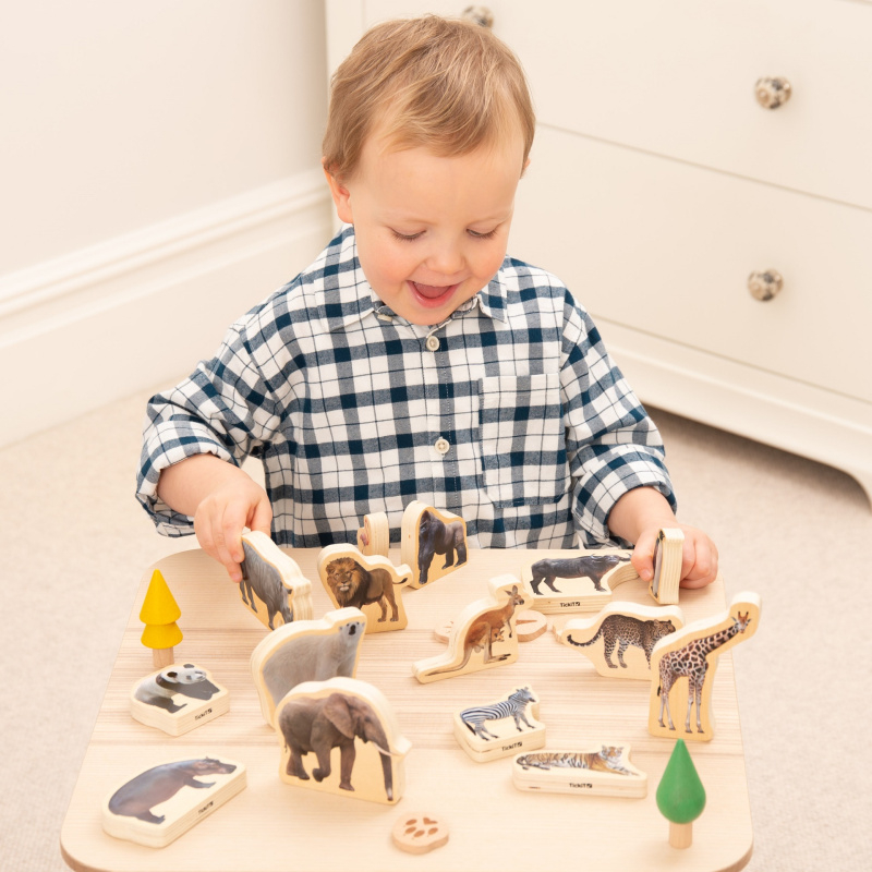 Artikelnummer: CT73572 OverzichtStevige en lichtgewicht blokken van berkenmultiplex, aan beide zijden bedrukt met kleurenfoto's van 15 wilde zoogdieren en vogels. Perfect voor kinderen om fantasierijk mee te spelen, hun beschrijvende taalvaardigheid te ontwikkelen en te leren over dieren van over de hele wereld. De robuuste houten blokken voelen glad aan en zijn gemakkelijk te hanteren, rechtop te zetten en te stapelen voor kleine kinderen.