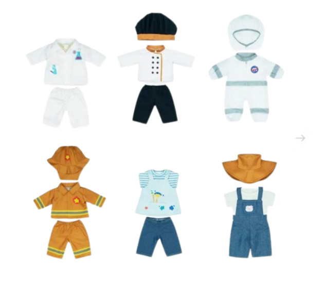 Artikelnummer: ML31539 OverzichtEen mooie set met 6 sets kleding voor bepaalde beroepen, voor poppen van 38 cm.