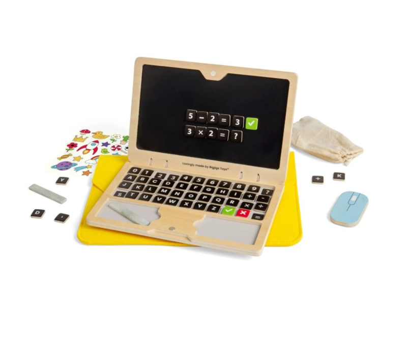 Artikelnummer: BJT757 OverzichtLeer en teken met deze speelse houten Tech Set. Open de speelgoedlaptop en speel met de magnetische letters, cijfers en symbolen, en vergeet niet het schoolbord, het krijt en de muisgum te gebruiken! Kinderen kunnen de laptop zelfs personaliseren met de geweldige stickerset en hem onderweg in de handige draagtas stoppen.
