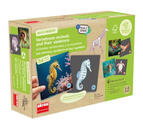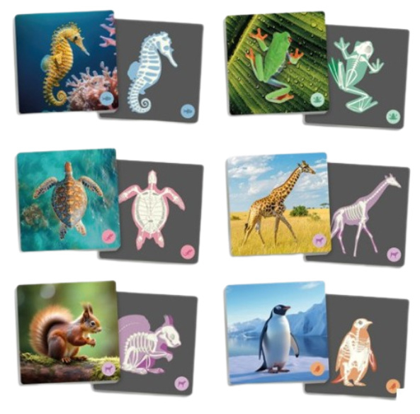Artikelnummer: A20420 OverzichtOntdek gewervelde dieren en hun skeletten via een memory-spel met grote kaarten met echte afbeeldingen. Hiermee kunnen kinderen hun geheugen trainen, hun aandacht verbeteren en meer te weten komen over de gewervelde dieren in de dierenwereld: zoogdieren, reptielen, vissen, vogels en amfibieën.