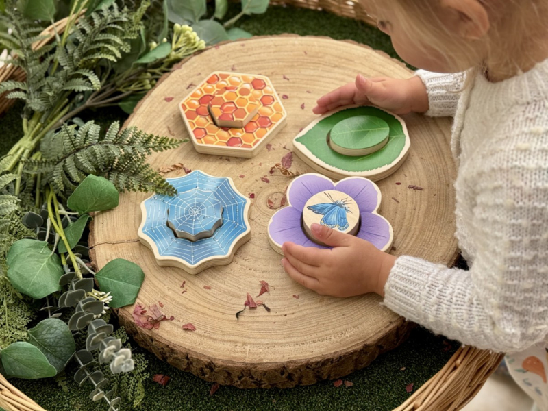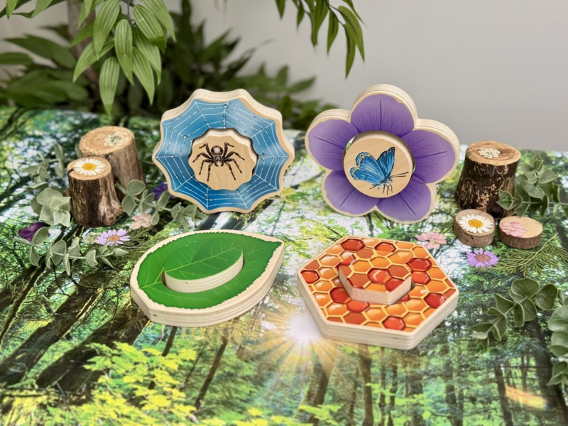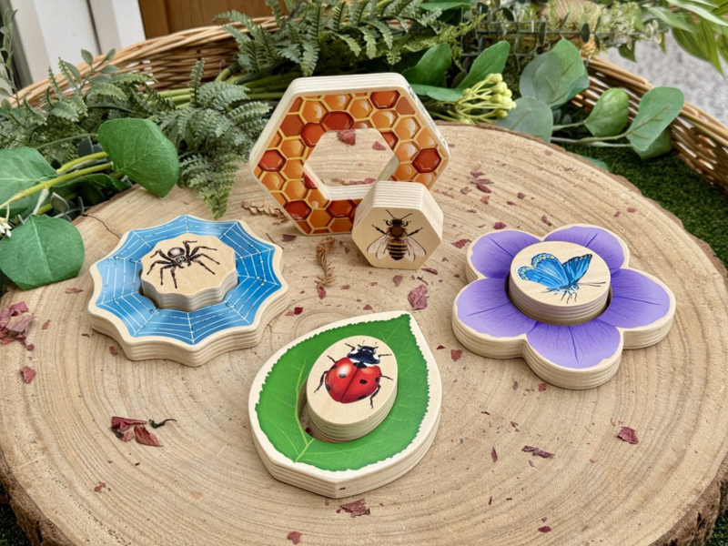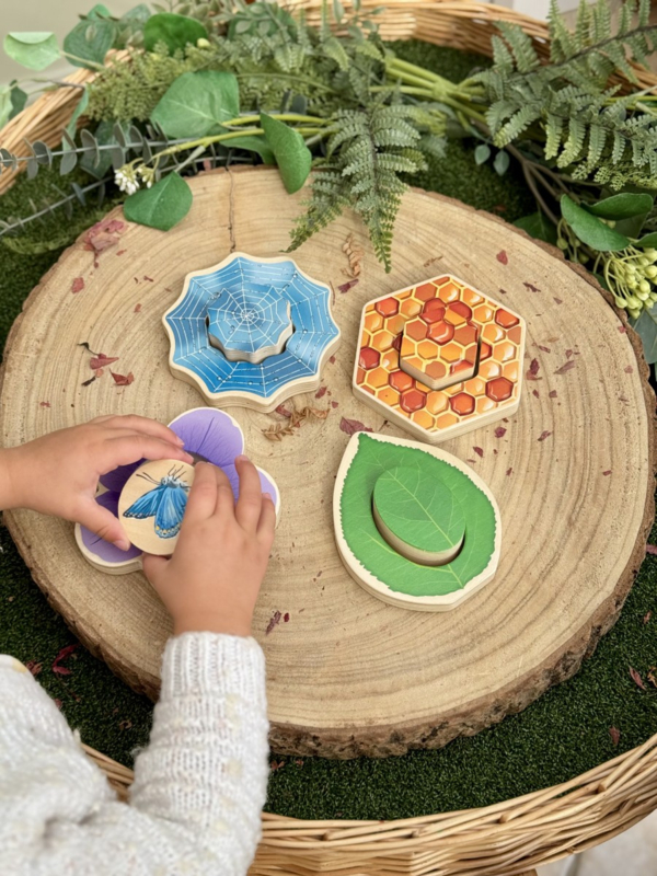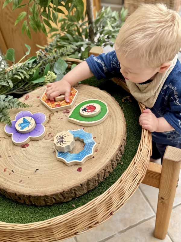 Het buitenste stukje toont een habitat, terwijl het binnenste stukje de habitat compleet maakt of omgedraaid kan worden om het verborgen diertje te onthullen! Kinderen ontwikkelen hun fijne motoriek en hand-oogcoördinatie terwijl ze een vlinder op een bloem, een bij in een honingraat, een lieveheersbeestje/insect op een blad en een spin in een web plaatsen.