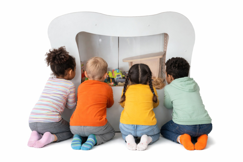 De kast staat op wielen, waardoor hij makkelijk te verplaatsen is binnen de groep of klas. Zo wissel je eenvoudig van thema of creëer je snel een nieuwe leer- en speelhoek. De openingen en ramen prikkelen de nieuwsgierigheid en stimuleren spel, taalontwikkeling en fantasie.