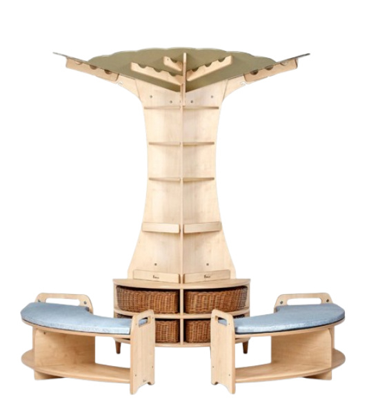De kenmerkende luifel blijft een prachtig element, compleet met open haken voor kerstverlichting en gesloten lussen voor het ophangen, rijgen of draperen van kunstwerken en decoraties. De stevige esdoornstam is voorzien van hoekdisplayplanken en zorgvuldig ontworpen boekenplanken die kinderen aanmoedigen om op ontdekkingstocht te gaan en zelf hun favoriete verhalen uit te kiezen.