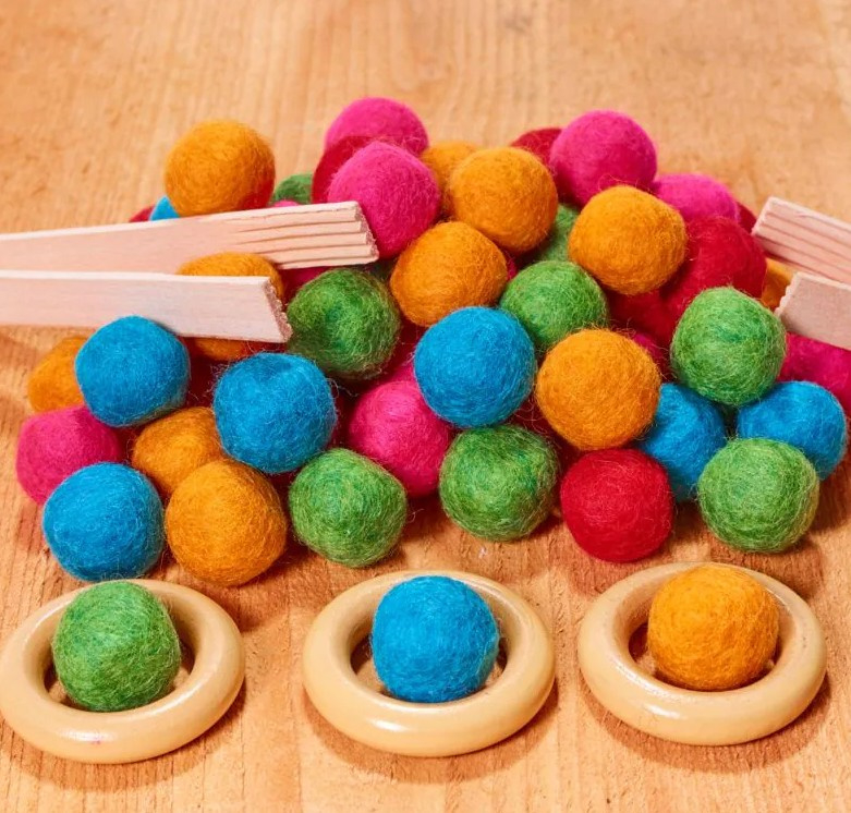 Gebruik deze 64 vilten balletjes in verschillende maten en kleuren voor sorteren en rangschikken. Gebruik ze voor vroeg tellen, kleuren matchen of groeperen op grootte. Doe ze in uw knutselbak, voeg ze toe aan klein wereldspel of stel fijne motorische uitdagingen op met pincetten en potjes.