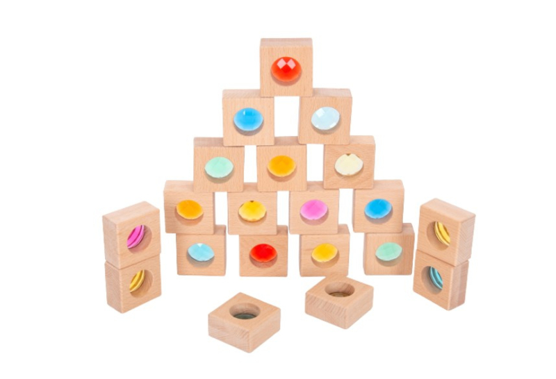 Wanneer ze met licht worden belicht, ontstaan er intrigerende patronen die gesprekken over reflecties op gang brengen. Deze blokken zijn perfect voor fantasierijk spel, waarmee kinderen ramen, deuren, kleurrijke versieringen of alles wat hun creativiteit ingeeft kunnen maken.