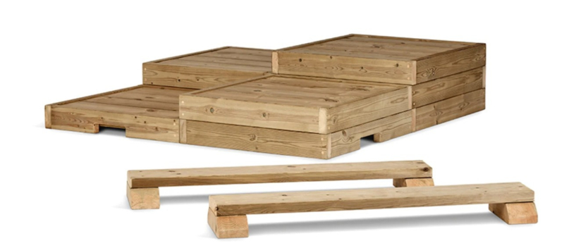 Laag podium: B 660 x D 660 x H 95 mm, middelhoog vierkant podium: B 660 x D 660 x H 190 mm, hoog vierkant podium: B 660 x D 660 x H 285 mm, balk: B 1000 x D 145 x H 95 mm