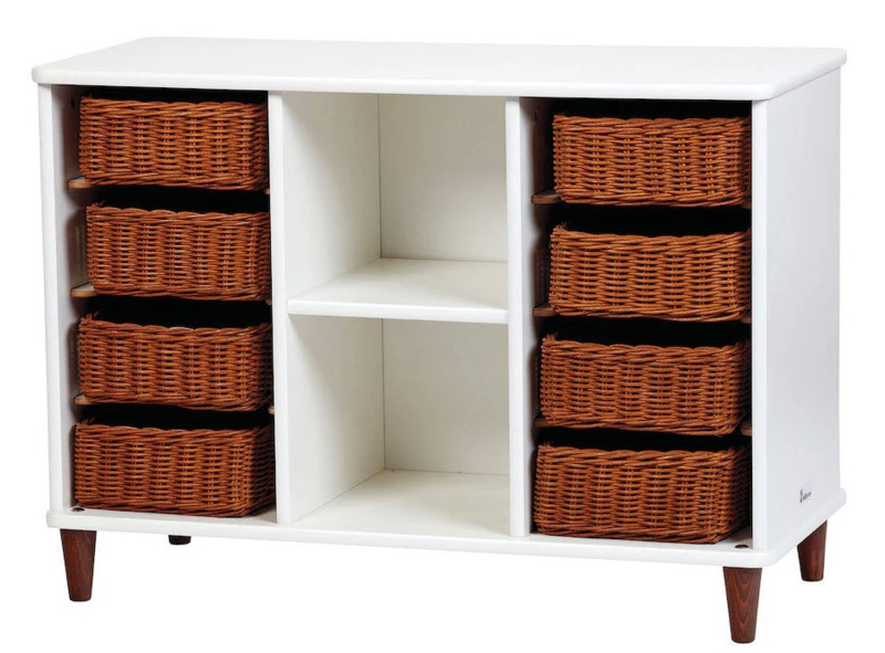 Artikelnummer: MH934 OverzichtWitte vrijstaande opbergunit met twee planken en acht ondiepe opbergmanden voor spullen, speelgoed en apparatuur.