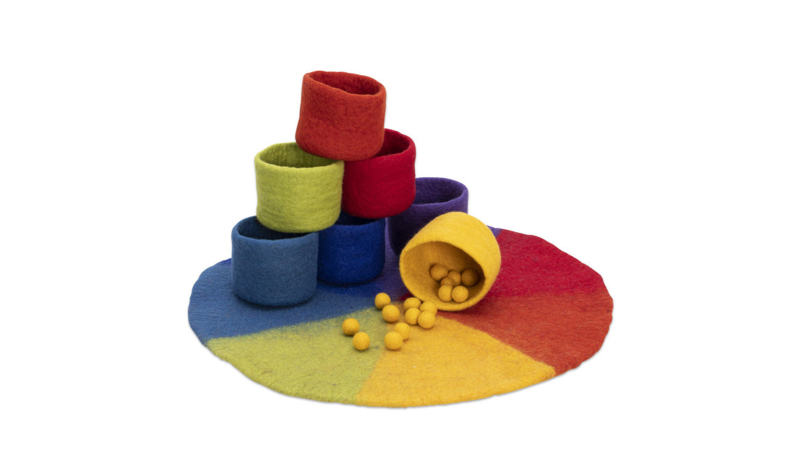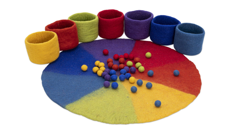 Deze prachtige 120-delige vilten set is handgemaakt en bestaat uit een 7-voudig verdeelde viltmat in zachte regenboogkleuren met 7 bijpassende sorteerschalen en 16 per kleur gesorteerde vilten balletjes. Diverse toepassingen mogelijk, zoals bijv. bij kleuroefeningen, legspelletjes of het ontwerpen van fantasierijke patronen. Met deze sorteerset kunnen de kleintjes ook hun eerste teloefeningen doen. Je kunt de set ook gebruiken voor de indeling in de weekcirkel – elke kleur staat voor een andere weekdag. Gebruik de set onder andere voor vrij spel, decoratieve ontwerpen en het presenteren van een magisch sprookjeslandschap.