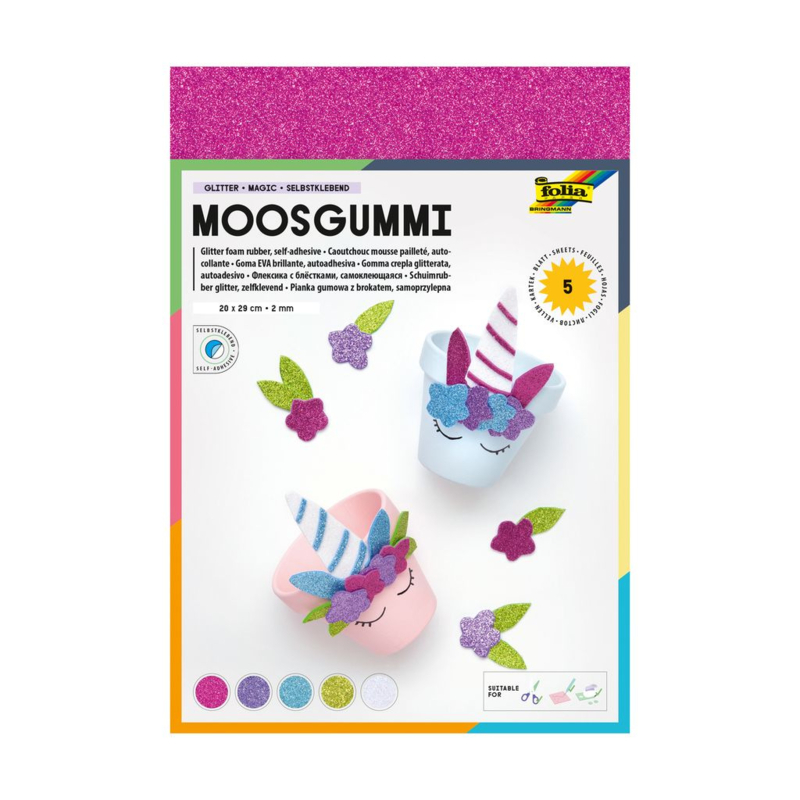 Knutselrubber glitter in 5 kleuren: roze, paars, blauw, groen, wit.