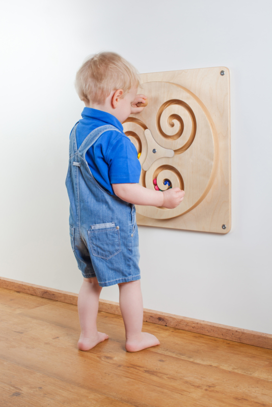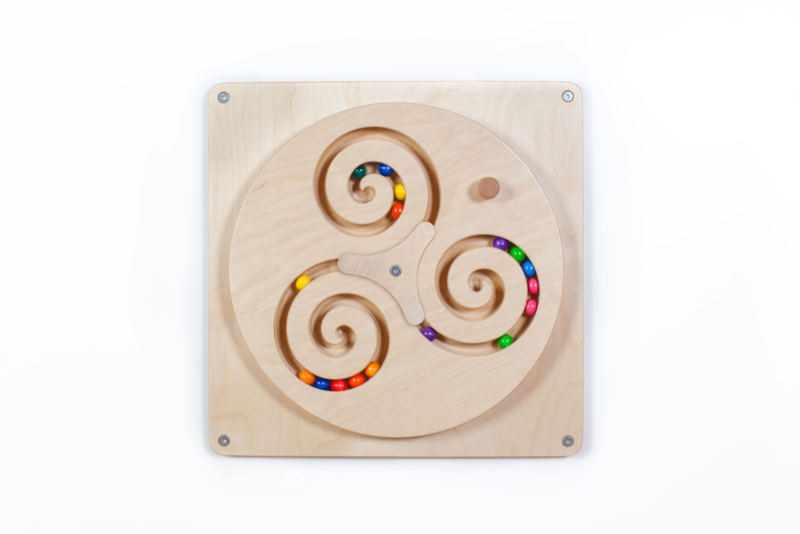 Wanneer de grote ronde schijf wordt gedraaid met behulp van het houten handvat, veranderen de gekleurde ballen binnen het ingesloten circuit van het wandspel in een kleurrijk spektakel.